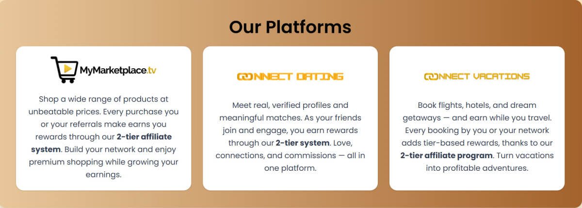 Meet real, verified profiles and meaningful matches. As your friends join and engage, you earn rewards through our 2-tier system. Love, connections, and commissions — all in one platform.Book flights, hotels, and dream getaways — and earn while you travel. Every booking by you or your network adds tier-based rewards, thanks to our 2-tier affiliate program. Turn vacations into profitable adventures.